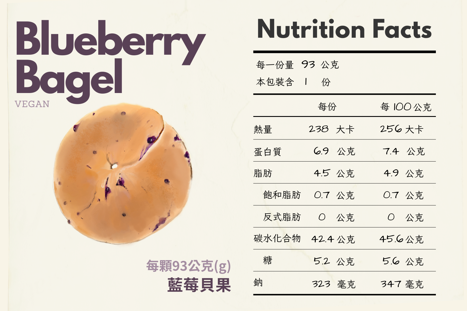 商品詳情 藍莓貝果(全素) 嚴選食材獨家自培老麵種 商品屬性: 全素 成分:麵粉、無加糖豆漿、水、藍莓(粒、醬)、二砂、胡麻油(芝麻)、赤穗天鹽、酵母 淨重: 93g 過敏原標示: 含麩質之穀物及其製品、大豆及其製品、芝麻及其製品 營養標示 藍莓貝果 TWD $55 TWD $55