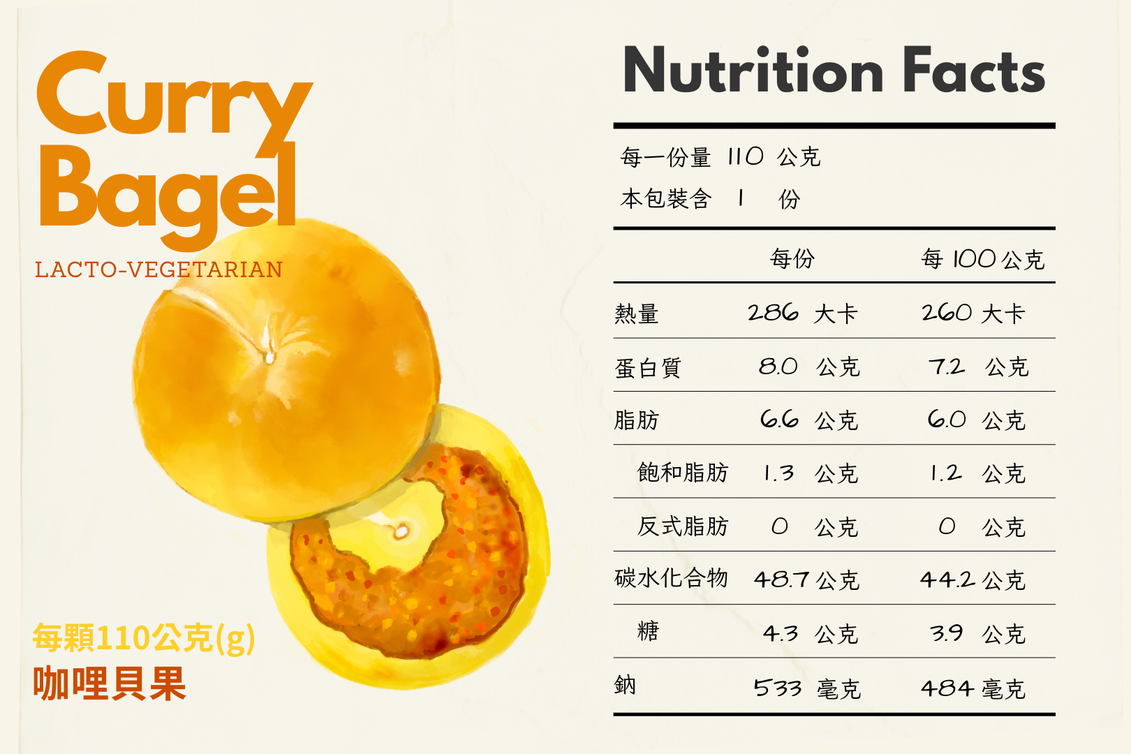 成分:麵粉、咖哩餡、無加糖豆漿、水、胡麻油(芝麻)、二砂、酵母、赤穗天鹽、薑黃