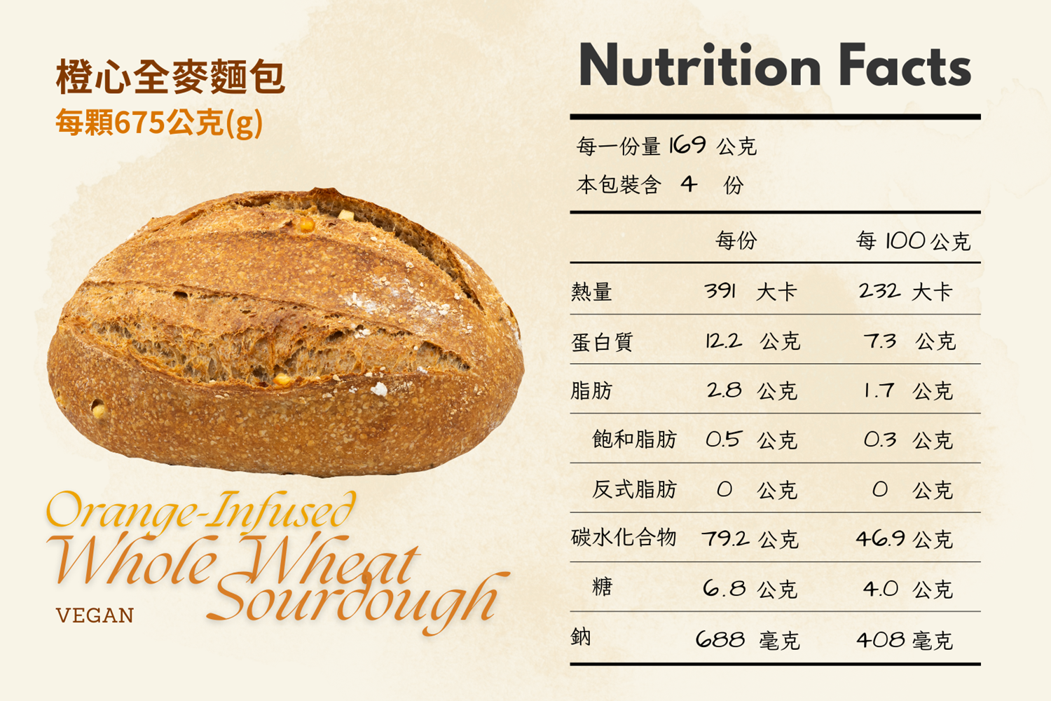 商品詳情 橙心全麥麵包(全素) 嚴選食材獨家自培老麵種 商品屬性: 全素 成分:麵粉、水、桔子皮、赤穗天鹽 淨重: 675g(整顆)/337g(半顆) 過敏原標示: 含麩質之穀物 營養標示 橙心全麥麵包 TWD $125 ~ 240 TWD $125 ~ 240